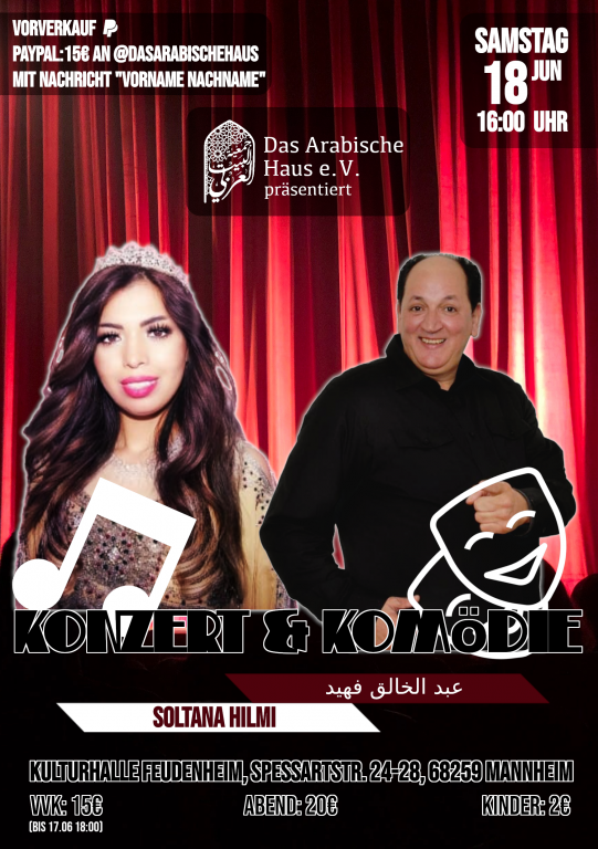 Um am Vorverkauf teilzunehmen unserem Paypal-Account @dasarabischehaus 15€ senden. In der Nachricht Vor- und Nachname der Person angeben. Bitte Ausweis zur Veranstaltung mitbringen.